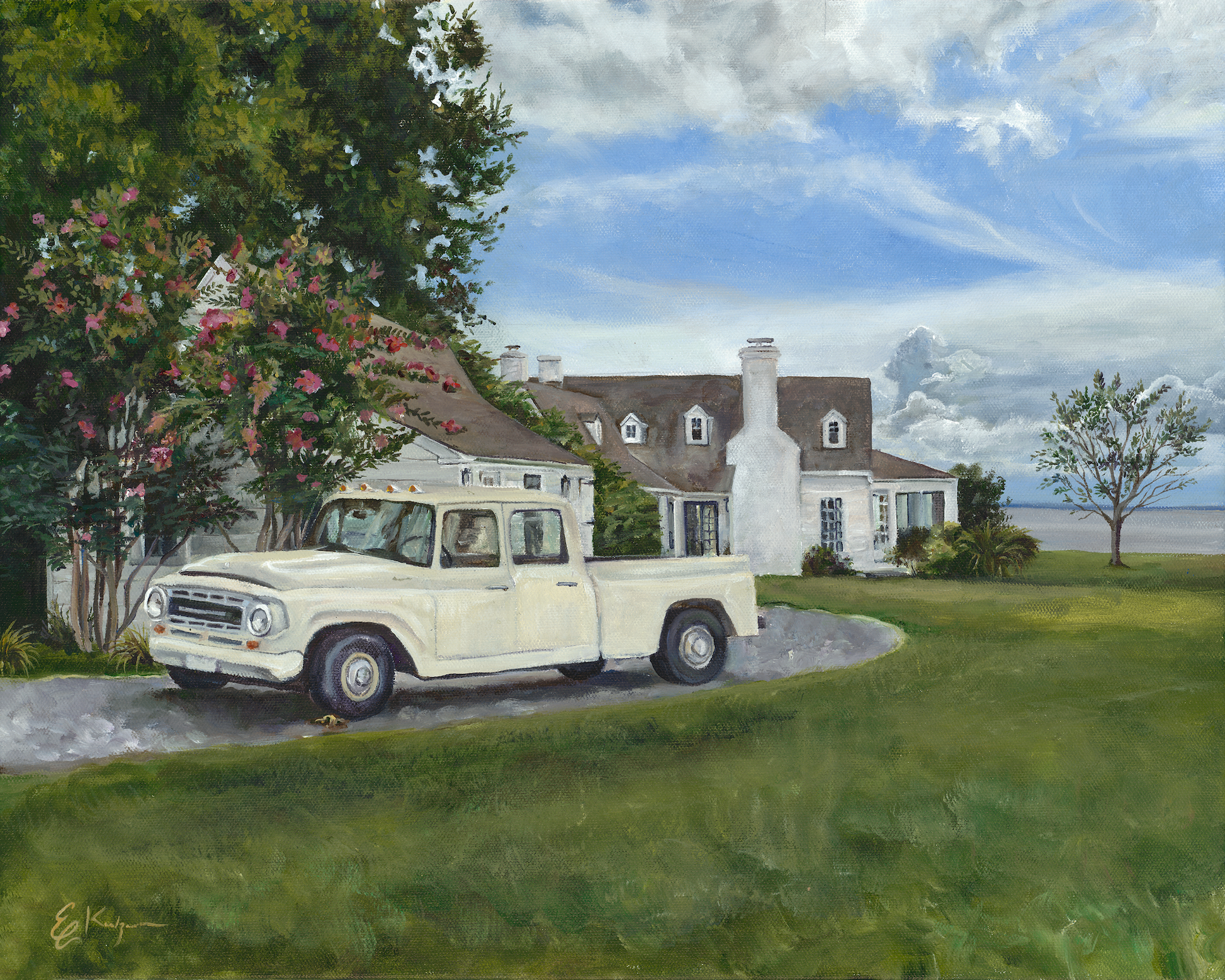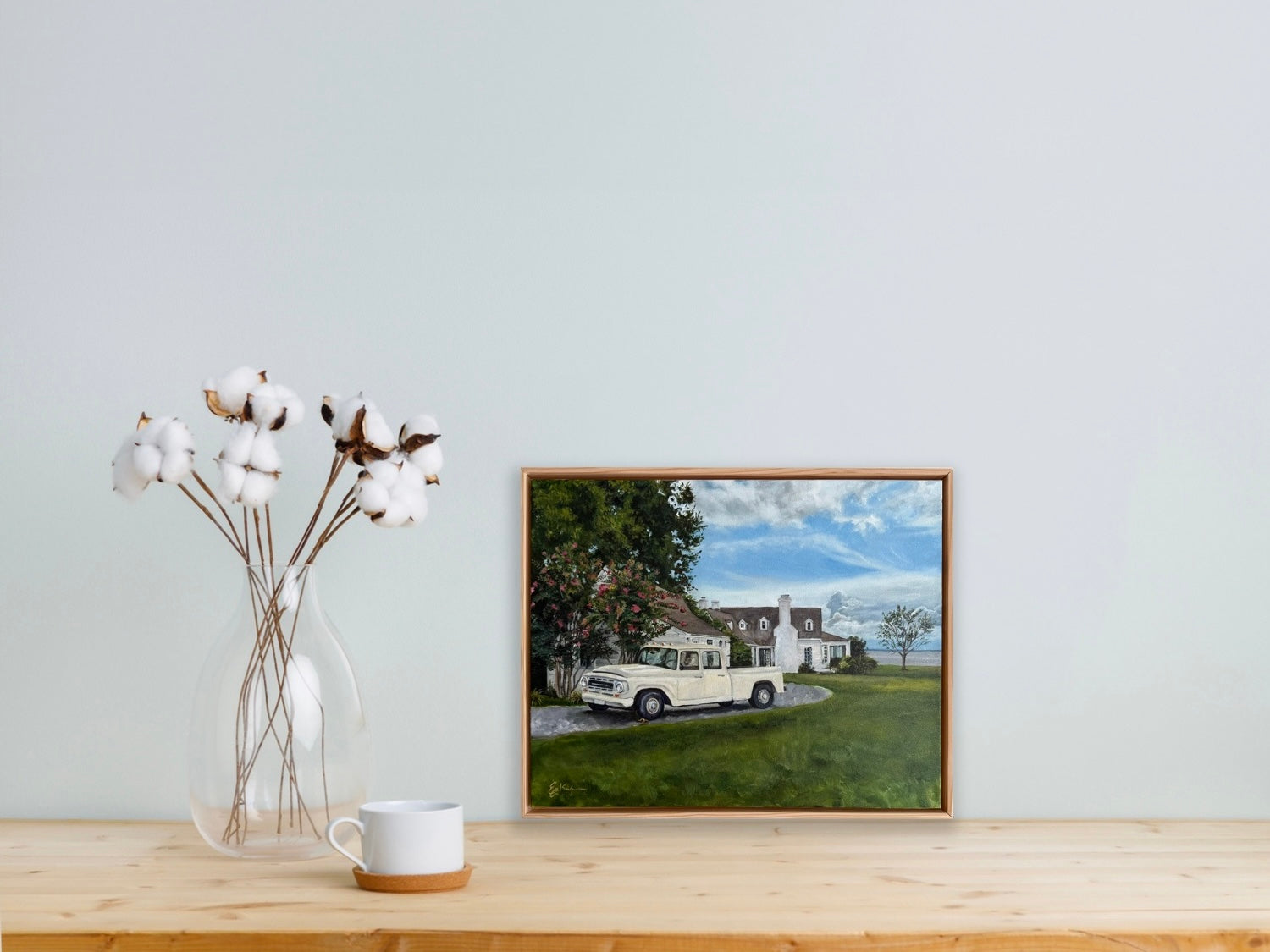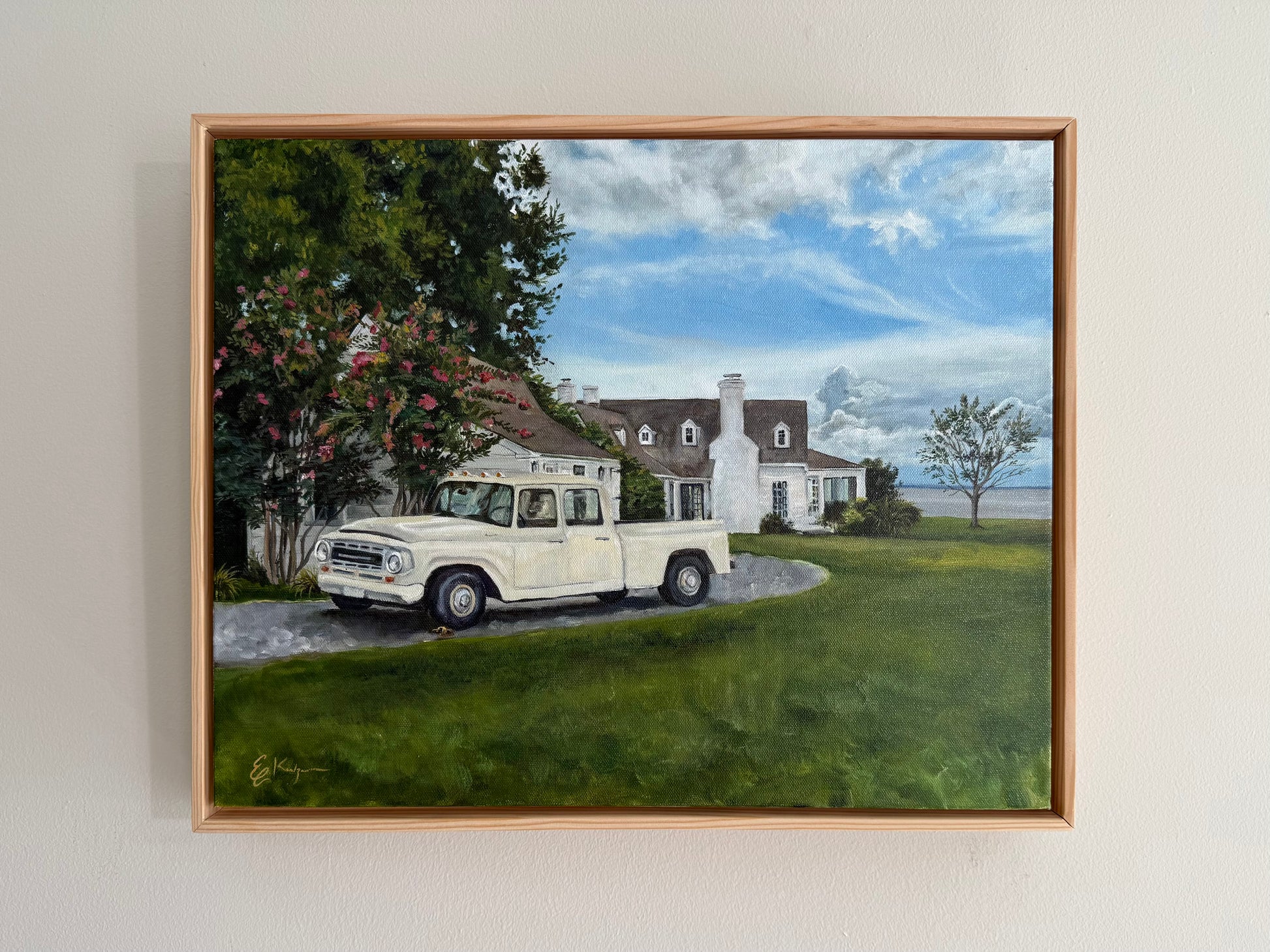Seeing a vintage truck in a driveway provokes nostalgic memories of riding in a 1955 Ford truck with my dad on the weekends. We would make our routine visit to dump yard waste, then get ice cream together. On my wedding day, I was adamant that my dad drove me and my husband away in a vintage car. It was the beginning of a new chapter, but the familiar smell of rusty bolts and breeze whistling through the windows remained. I hope this painting provokes fond memories in the viewer that carry value throughout a lifetime.