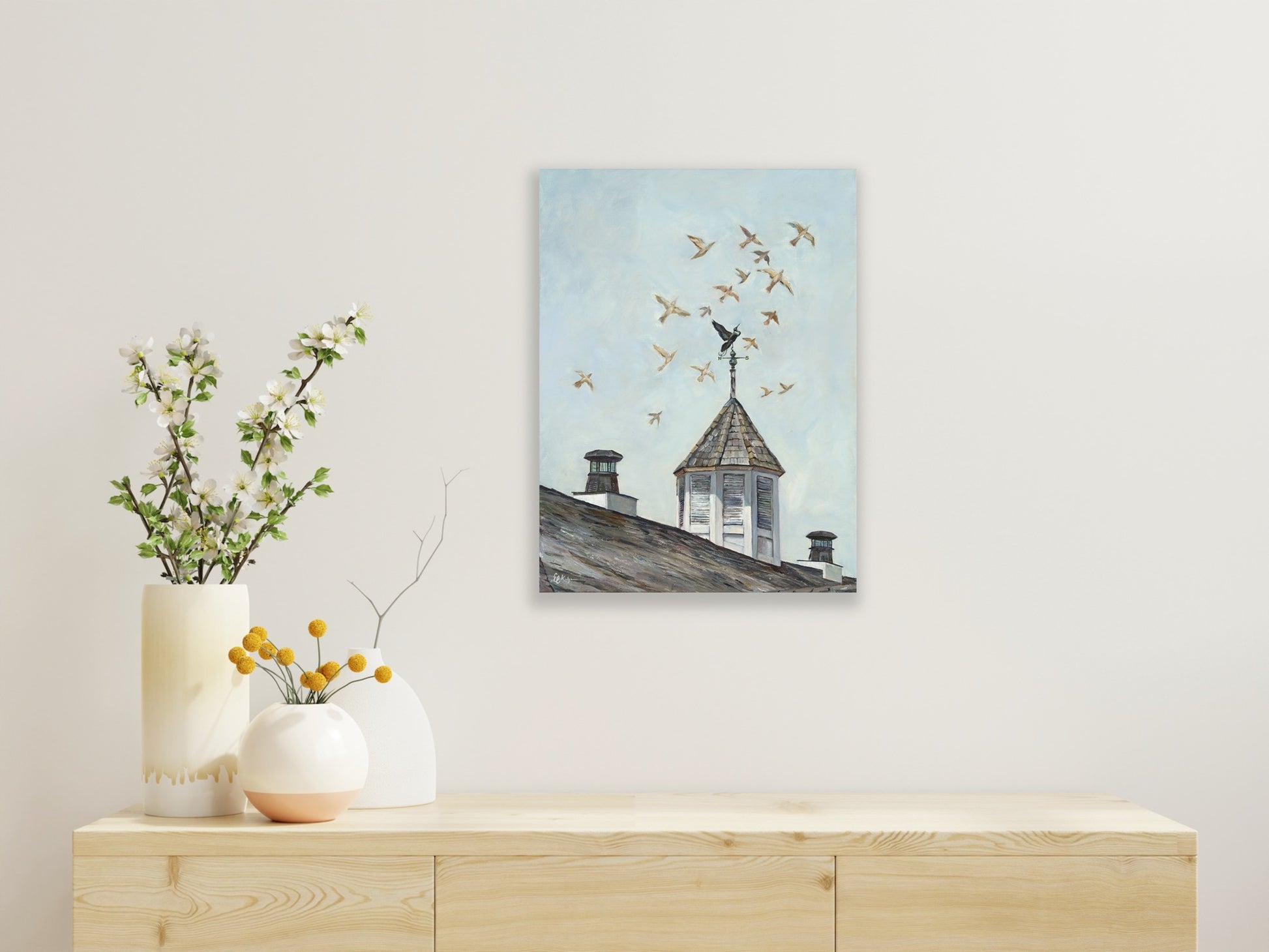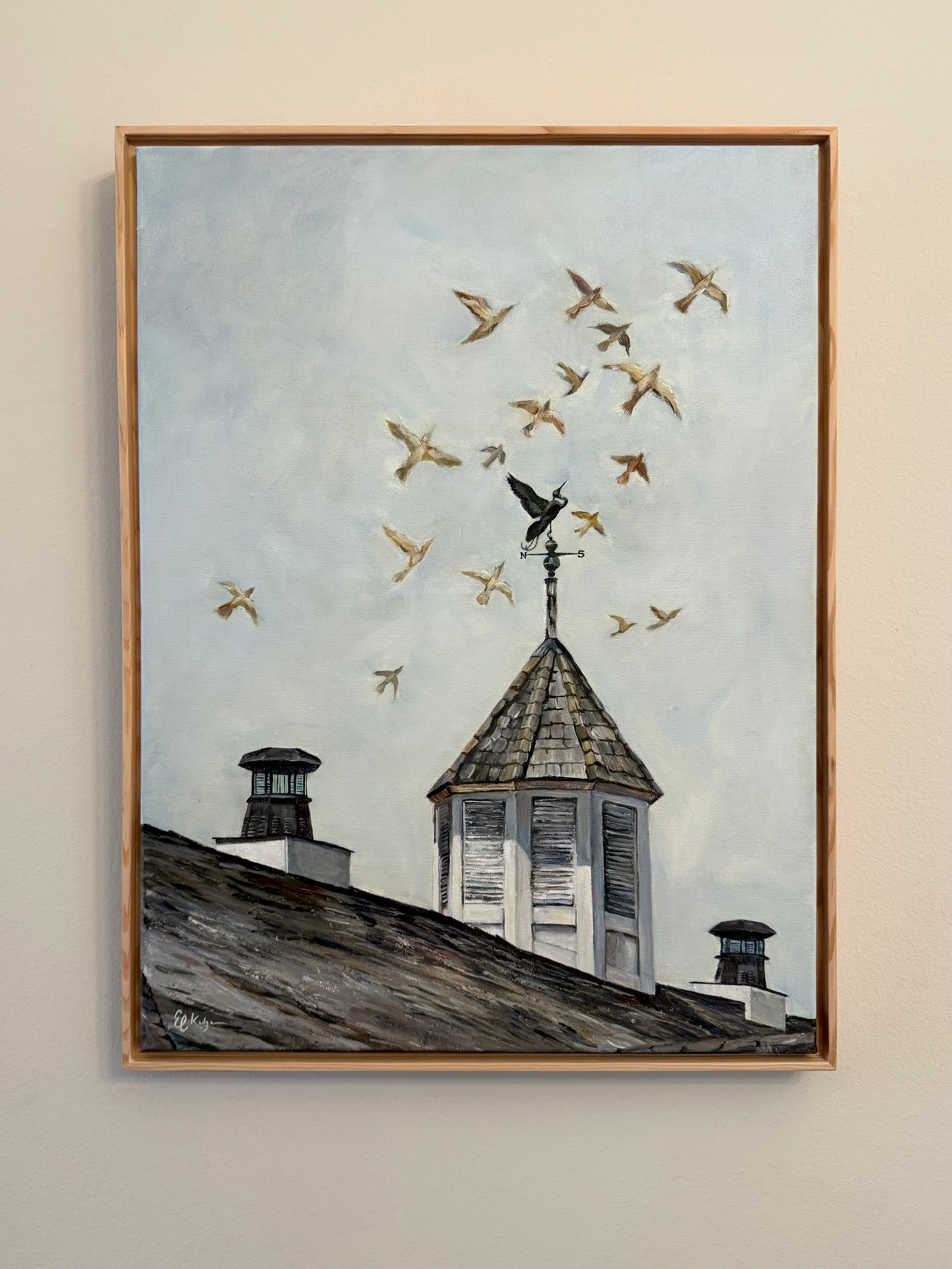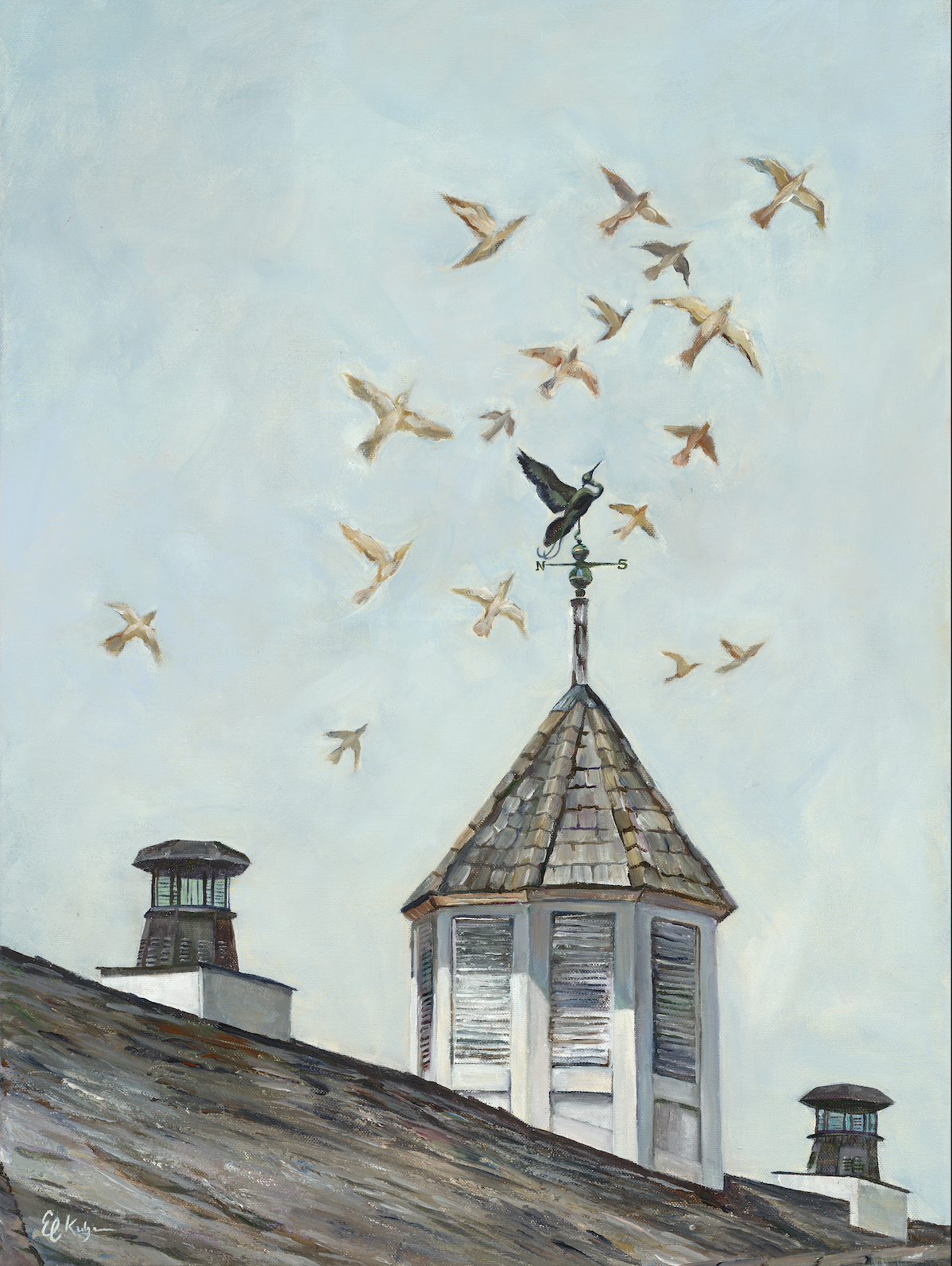 This painting applies more artistic license to create an ethereal backdrop to a traditional architectural composition. The contrast of the stationary weathervane gazing to the birds in flight is used to suggest someone who is stuck in their ways but longing to break free from their reality. Many people wonder how their life could be different if they chose to live authentically versus being anchored in what they should be doing. This work is aimed to inspire the viewer to seek the golden light, trust in the divine, and let go of limiting beliefs so that you can take flight towards your purpose!