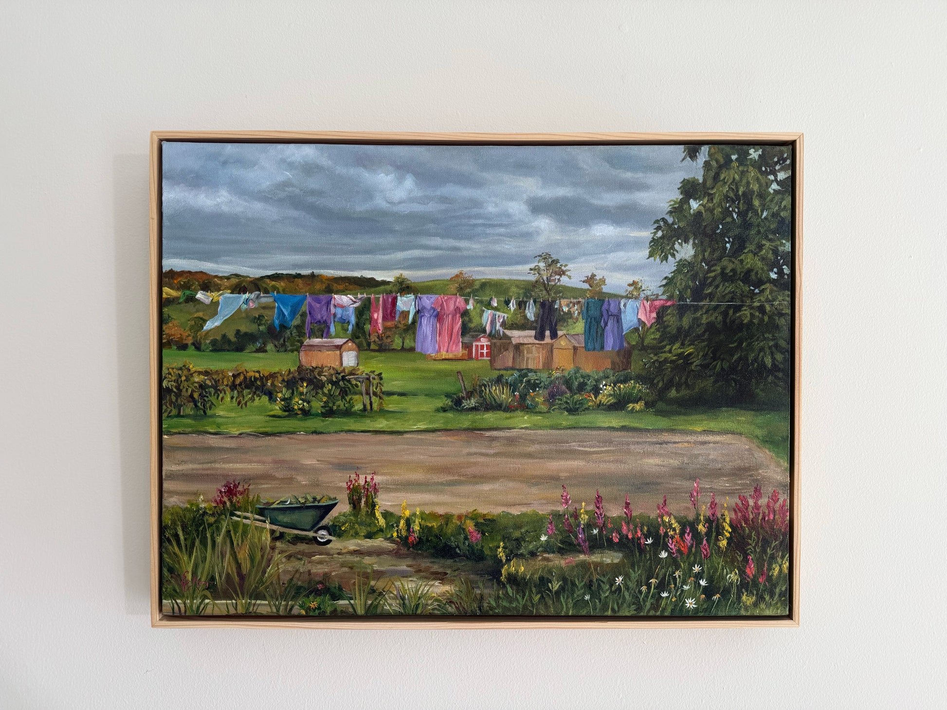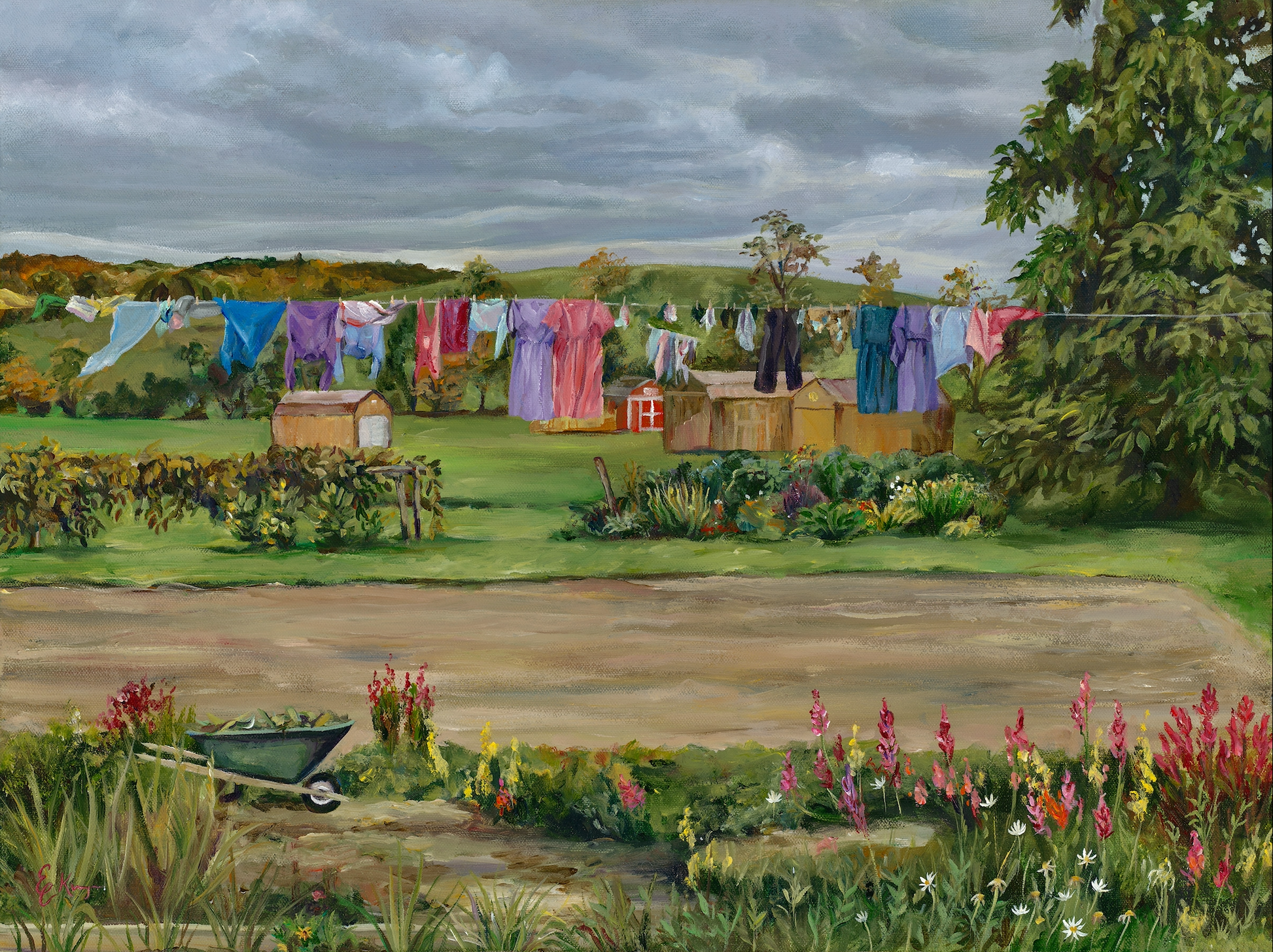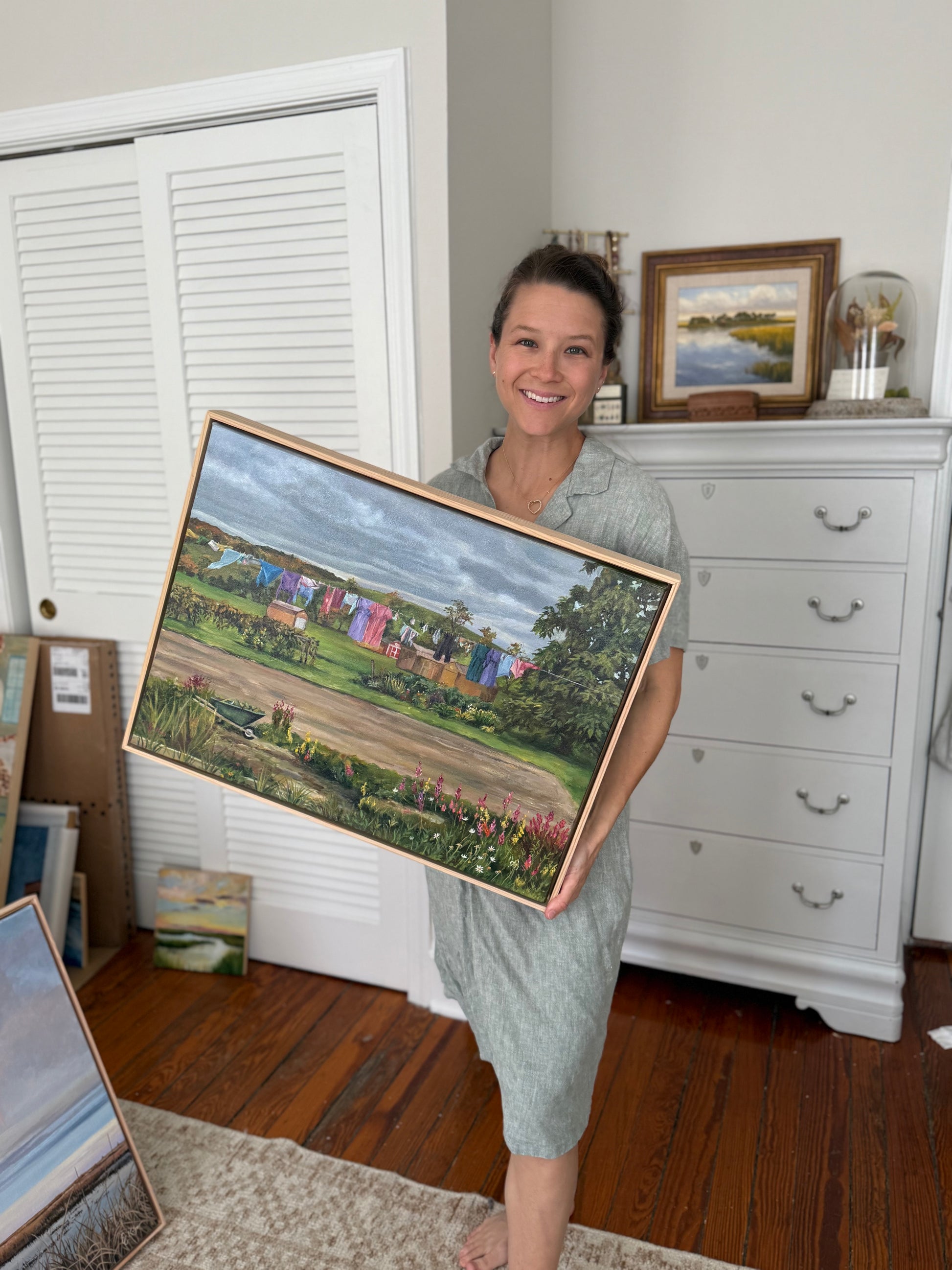 This painting is a reminder to live more simply. It also urges the viewer to stop and admire the flowers along the journey. There is also a breeze in the painting, apparent by the movement in the laundry, which is reminder to take a deep breath. I called it “Put It on the Line” to express giving over your burdens, trusting some things will take care of themselves.